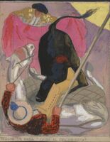 El principe Oton En este dibujo firmado, en el que destacan grandes llamas de tonos naranjas y grises, se encuentra una gran multitud exaltada con sus instrumentos de trabajo en ristre. Las figuras son de color negro.Prueba de imprenta. Ilustración realizada para la revista semanal de Novelas y Cuentos. Titulo: El principe Otón Autor:R. L. Stevenson; Nº publicado: Fecha: 866; Tomo NC. 23; Boceto No.