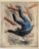 EL PUENTE DE LAS ANIMAS. Enmarcado y sobre un fondo grisáceo claro, en la parte superior de la imagen, se vislumbra un objeto volador, que podrían ser unas nubes, del que se desprenden tres brazos con largos y temibles dedos, rayos, que acechan a un hombre de figura estilizada y oscura que corre sobre un suelo formado por círculos azules concéntricos.Boceto realizado para la ilustración de la revista semanal Novelas y Cuentos. Titulo: El puente de las animas. Autor: Pio Baroja: Nº publicado: 1330. Fecha: 04-11-1956. Tomo: 25. PI/ No