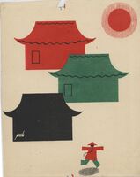 EL PROSCRITO. En un fondo claro y en un dibujo enmarcado se visualizan tres casas de estilo oriental. Siguiendo una detrás de la otra destacan una negra, una verde y por último una roja. Al fondo, cercano a la casa roja brilla un sol rojo y al lado de la casa negra una mancha negra parece un hombre corriendo.Boceto realizado para la ilustración de la revista semanal Novelas y Cuentos. Titulo: El Proscrito. Autor: Lewis Stanton Paley. Nº publicado: 87. Fecha: 07-03-1948. Tomo NC. 6
