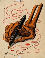 EL RELATO DE UN MUERTO. Sobre una hoja de papel en blanco una mano esquelética escribe con una pluma. En todo el dibujo destacan líneas ondulantes de color rojo como también algunas manchas. La composición está firmada.Prueba de imprenta. Ilustración realizada para la revista semanal Novelas y Cuentos. Titulo: El relato de un muerto. Autor: Shieply Adans. Nº publicado: 1008. Fecha: 03- 09-1950. Tomo NC.: 26