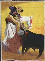 El rejoneador le clava su lanza al toro En este dibujo, cuyo fondo es amarillo y su superficie ligeramente cuadriculada, se representa la escena en que un rejoneador, sobre un caballo blanco, le clava al toro negro una lanza en su lomo.