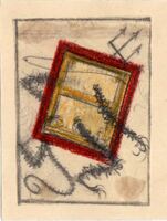 El RETRATO. Una ventana cerrada suspendida en el aire de color rojo y amarillo está envuelta por líneas serpenteantes negras, gruesas con adornos en flecos y un tridente, también negro. El dibujo está enmarcado. Parece hacer mención al diablo.Boceto realizado para la ilustración de la revista semanal Novelas y Cuentos. Titulo: El retrato. Autor: Nicolás Gogol. Nº publicado: 1049. Fecha: 17-06-1951. Tomo NC.: 55.