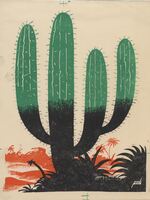 El TESORO DE CUAUHTEMOC. En esta composición firmada destaca en su centro la imagen de un gran cactus verde con cuatro brazos y en los que se ve muy bien los pinchos tan característicos de dicha planta. Su parte inferior tiene un color más oscuro.Prueba de imprenta. Ilustración realizada para la revista semanal Novelas y cuentos. Titulo: El tesoro de Cuauthemoc. Autor: Luis de <oteyza. Nº publicado: 1010. Fecha: 17-09-1950. Tomo NC.: 48.