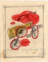 El triciclo caído en el suelo Enmarcada en este dibujo se deja apreciar la escena de un triciclo de ruedas rojas y sillín amarillo caído en el suelo. A su lado se ven manchas grandes de color rojo que nos habla de la muerte de un niño. el dibujo está doblemente enmarcado.Boceto realizado para la ilustración de la revista semanal Novelas y Cuentos. Titulo: Autor: Nº publicado: Fecha: Tomo NC.