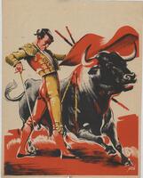El toreo En este dibujo firmado de temática taurina destacan dos figuras: el torero con su traje de luces amarillo y rojo mientras con una mano sostiene su capa y en otra una espada torea al toro negro que aparece con cinco banderillas sobre su lomo.Prueba de imprenta. Ilustración realizada para la revista semanal Novelas y Cuentos. Titulo: Autor: Nº publicado: Fecha: Tomo NC.: