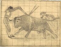 El toreo En el dibujo destaca la figura estilizada de un torero con su cuerpo contorneado elegantemente toreando al toro negro que se ve detrás de su imagen. En un segundo plano se ven las figuras de dos toreros. La escena se halla enmarcada y en una superficie cuadriculada.