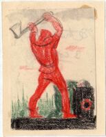 EL TROVADOR La escena de la decapitación se compone de un verdugo encapuchado, de espalda y con traje rojo, que empuña el hacha para llevar a cabo la ejecución. Sobre un madero se aprecia la figura arrodillada de un hombre condenado, con su traje verdeBoceto realizado para la ilustración de la revista semanal Novelas y Cuentos. Titulo: El Trovador. Autor: R. Ortega y Frias. Nº public.: 928. Fecha: 20-02-1949. Tomo NC. 10. PI/. 385