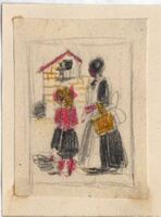EL TRIUNFO EN LA HUIDA. Observando una casa a lo lejos se encuentran en este dibujo enmarcado con líneas abocetadas, una niña de espalda con vestido rosa y negro y su ama de perfil con su uniforme negro y delantal blanco llevando un cesto de merienda.Boceto realizado para la ilustración de la revista semanal Novelas y Cuentos. Titulo: El triunfo en la huida. Autor: D. E. Stevenson. Nº publicado: 1159. Fecha: 26-07-1953. Tomo Nc.: 55.