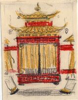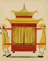 EL TRONO DEL REY MUERTO Y UNA EXTRAÑA DOLENCIA. El tema principal de este dibujo es una casita transportable de estilo oriental de color rojo y amarillo. Agarrando la casa se adivinan las figuras de los transportistas orientales con pantalón blanco y túnica amarilla al igual que los zapatos y el sombrero.Boceto realizado para la ilustración de la revista semanal Novelas y Cuentos. Titulo: El trono del rey Muerto y Una extraña dolencia. Autor: T. Newson y W. H. Ronse. Nº publicado: 1040. Fecha: 15-04-1951. Tomo NC. 39