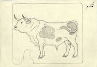 El toro con manchas grises Sobre un fondo claro y el dibujo enmarcado se destaca la figura de un toro blanco con manchas grises y en posición de perfil. Se puede vislumbrar en la parte superior de la izquierda, en una esquina, la firma del pintor.