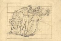El Sol, serie B Boceto a lápiz sobre fondo cuadriculado de la medalla titulada El Sol, en el anverso se aprecia la figura de una mujer vestida de época cobijándose con una sombrilla del sol junto a un caballero con un puro en la boca, junto al reverso donde se representa una plaza de toros cubierta por un gran cangrejo.Para la Casa dela Moneda serie B de Tauromaquia, titulada El Sol. Otros archivos: MEP/1607 MBR/1396