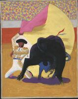 El toro y el banderillero En primer término se aprecia la pierna cubierta con un pantalón y media de color rojo, por su parte trasera, de un banderillero sosteniendo dos banderillas rojas y amarillas para clavárselas al toro negro que se dirige hacia él. Los colores que predominan en el fondo del dibujo son el amarillo y el morado.