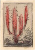 El TESORO DE CUAUHTEMOC. En un paisaje desértico en donde abunda la maleza creada por medio de manchas negras crece un gran cactus rojo de cuatro brazos y con pinchos. El dibujo está enmarcado.Boceto realizado para la ilustración de la revista semanal Novelas y Cuentos. Titulo: El tesoro de Cuauhtemoc. Autor: Luis de Oteyza. Nº publicado: 1010. Fecha: 17-09-1950. Tomo NC.: 48.