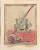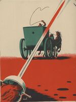 El tulipan negro. En un dibujo enmarcado y sobre un camino de color rojo se aleja en el horizonte un carro verde de caballos. En primer término se muestra una mano esgrimiendo un florete, la mano pintada de rojo..Boceto realizado para la ilustración semanal de la revista Novelas y Cuentos. Titulo: El tulipan negro; Autor: Alejandro Dumas; Nº public.: 768 fecha: 10-02-46 Tomo: 16