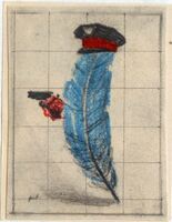 En el mundo del delito. Se representa una pluma de ave pintada de azul en la parte superior de la pluma una gorra de policía, hacia el medio una mano con una pistola. La firma en la parte inferior derecha.Prueba de imprenta. Ilustración realizada para la revista semanal de Novelas y Cuentos. Titulo: En el mundo del delito. Autor: J. F. Hutton.. Nº publicado: 1283. Fecha: 11 12 1955 Tomo NC.: 32