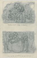 Elefante y dos hombres Un elefante color de rosa de gran masa corpulenta del que sólo se ve su cabeza situada en el lado izquierdo de la imagen enmarcada levanta una de sus patas sobre dos figuras humanas, una de ellas tendida en el suelo mientras otra la intenta incorporar. Ambas figuras tienen ropajes de color blanco con algunos trazos en rojo.Boceto realizado para la ilustración de la revista Novelas y Cuentos Titulo: Autor: Nº public.: Fecha: Tomo: PI/. no