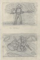 El venteo En este dibujo bajo el lema de “venteo” se pueden ver dos dibujos enmarcados. En el primero se ve a un hombre realizando la tarea del venteo. Y en el segundo se pueden ver a unos insectos volando por los aires. Predominan las líneas grises sobre un fondo claro. El lema se sitúa entre los dibujos.