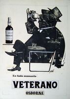 En todo momento Veterano Osborne Perfil de la silueta de un hombre robusto que bebe una copa sentado en una silla con las piernas cruzadas, dentro del caballero se puede apreciar un fondo compuesto por una fotografía con gente en una terraza, debajo se puede leer “en todo momento Veterano Osborne”.