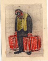ES PELIGROSO ASOMARSE AL EXTERIOR. En el dibujo firmado destaca la imagen de un mayordomo con pantalón negro y chaleco amarillo con rayas negras llevando en cada mano una maleta roja, viéndose en una de ellas pegatinas blancas y amarillas. En su cara se nota un gesto de enfado.Prueba de Imprenta. Ilustración realizada para la revista semanal Novelas y cuentos. Titulo: Es peligroso asomarse al exterior. Autor: E. Javier Poncela. Nº publicado: 1058. Fecha: 19-08-1951. Tomo NC. 45.