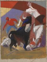 Envestida del toro al caballo blanco del rejoneador En el dibujo cuya superficie está ligeramente cuadriculada en el que se destacan los colores morado, amarillo oscuro y rojo, se desenvuelve la escena en la que un toro enviste al caballo blanco del rejoneador tirándolo por los aires. En segundo plano se ve la figura de un hombre con pantalón azul y camiseta roja.