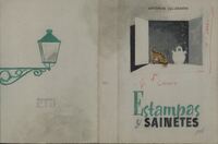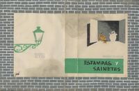 Estampas y sainetes (Portada) Sobre un fondo de pared de ladrillo gris, el cartel de Estampas y Sainetes de Antonio Calderón, a un lado la imagen de un farol en verde como el rótulo del cartel donde encima se aprecia el dibujo de una ventana abierta en cuyo quicio se encuentra un gato pardo junto a un botijo blanco.