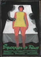 Españolas en parís Firmado este cartel en su parte superior, a la derecha y en color azul se ve la imagen de una mujer de pelo oscuro con un vestido amarillo echada en una camilla blanca y siendo observada por algunas figuras a los lados de la composición. El título está en la parte inferior y es de color verde. Por debajo se ven algunas palabras abocetadas de complicada lectura.