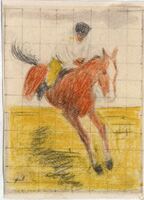 HANIA. Un caballo marrón con una mancha blanca en su frente y su jinete con pantalón amarillo, camisa blanca y gorro negro se disponen a saltar un gran muro amarillo. La superficie del dibujo se halla cuadriculada y hacia el lado derecho se puede vislumbrar el boceto de la firma del pintor.Boceto realizado para la ilusgtracion de la revista semanal Novelas y Cuentos. Titulo: Hania. Autor: E. Sienkiewockz. Nº publicado: 1212. Fecha: 01-08-1954. Tomo NC. 55.