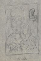 Hambre Boceto a lápiz, con la imagen en primer término de un hombre famélico junto a un niño, con la mano extendida pidiendo ayuda, y en la esquina superior la figura de una persona sentada con las manos en la cara con aptitud de sufrimiento.