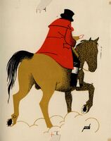 GUY MANNERING O EL ASTROLOGO. En esta composición firmada por su autor se ve la figura de un jinete y con un niño, sentado con él adelante, solo se dislumbra la cabecita que el pelo es rojo y una mano, el jinete con una chaqueta roja llevando, además, un sombrero largo y negro sobre un caballo marrón. Las figuras se ven desde su parte trasera.Prueba de imprenta. Ilustración realizada para la revista semanal de Novelas y Cuentos. Titulo: Guy Mannering o el Astrólogo. Autor: Walter Scott. Nº publicado: 1334. Fecha: 1956. Tomo NC. 34.
