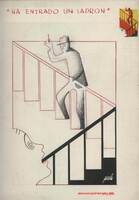Ha entrado un ladrón. En este dibujo, enmarcado por una línea roja en donde se puede ver la silueta de una cara en al esquina de la parte inferior a la derecha, se ha representado a un hombre subiendo por una escalera negra y roja llevando en una de sus manos lo que podría ser una vela. En la parte superior se puede leer en letras rojas “ha entrado un ladrón”. En la esquina de la parte superior de la izquierda se puede ver un recuadro, en un tamaño diminuto, de un hombre subiendo por una escalera roja y con el fondo de la pared amarillo. El dibujo está firmado.Original para presentar a la imprenta para la tirada luego de las portadas.