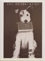Guías Afrodisio Aguado Imagen en blanco y negro del cartel publicitario de las Guías Afrodisio Aguado, en cuyo primer término aparece un perro blanco con un libro entre sus dientes sobre el fondo oscuro.