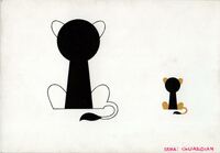 Guardián Sobre un fondo blanco se han dibujado a dos gatos sentados y de espalda. El de la derecha, blanco y negro, es de un tamaño mayor que el de al izquierda, negro y marrón. La forma del soporte es rectangular y en letras rosas se ha titulado el dibujo como guardián.