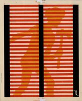 LA CASA DE LA MUERTA. Detrás de unas líneas de un color rosa fuerte en disposición horizontal y de unas líneas negras verticales, a los lados y en el centro, se deja ver en color amarillo la silueta de una figura femenina de perfil.Boceto realizado para la ilustración de la revista semanal Novelas y Cuentos. Titulo: La casa de la muerta. Autor: A. Abbor. Nº publicado: 1236. Fecha: 16-01-1955. Tomo NC.: 60.