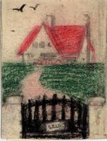 LA CASA SOLARIEGA. El tema de este dibujo es la vista desde un portal pequeño y de madera, de donde cuelga un letrero blanco que dice “seld”, hacia el interior de una propiedad viéndose un gran jardín y un camino que conduce a una gran casa con los tejados muy rojos y sus paredes blancas. Dos pájaros revolotean por el cielo.Boceto realizado para la ilustración de la revista semanal Novelas y Cuentos. Titulo: La casa solariega. Autor: Enrique Sienkiewice.Nº publicado: 789. Fecha: 23-06-1946. Tomo NC. 11.