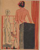 La modelo del artista En este dibujo firmado se ha representado el interior del estudio de un artista en el que aparece, en primer término, una mujer desnuda sosteniendo una túnica, de espalda y con el cabello negro recogido. En un segundo plano se vislumbran las manos del artista realizando una escultura. Destacan en el dibujo los colores blanco, negro y rojo.Prueba de imprenta. Ilustración realizada para la revista semanal Novelas y Cuentos. Titulo: Autor: Nº publicado: Fecha: Tomo NC.: