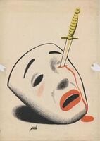 LA MONTAÑA. Sobre un fondo claro y en el dibujo firmado destaca la imagen de una máscara blanca con una gran boca roja, abierta y con una expresión dolorosa mientras un puñal está clavado en su ojo izquierdo del que además se desprende la sangre provocada por la herida.Prueba de imprenta. Ilustración realizada para la revista semanal Novelas y Cuentos. Titulo: La montaña. Autor: N. S. Lieskoy. Nº publicado: 961. Fecha: 09-10-1949.. Tomo NC.: 8.