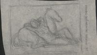 La mujer desnuda y el caballo Primer boceto apaisado de la imagen de una mujer desnuda recostada sobre el lomo de un caballo sentado sobre sus patas.