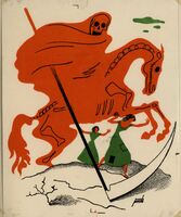 La muerte de rojo sobre un caballo En este dibujo firmado aparecen dos muchachas con sus vestidos verdes y pelos negros corriendo ante la persecución de la muerte representada en este caso sobre un caballo llevando su guadaña y toda la figura de color rojo.Prueba de imprenta. Ilustración realizada para la revista semanal Novelas y Cuentos. Titulo: Autor: Nº publicado: Fecha: Tomo NC.