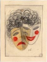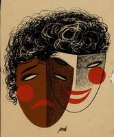 LILY, ACTRIZ Y MUJER. Dos máscaras se representan en esta composición firmada. Ambas tienen el pelo negro con rizos. La primera con el semblante triste es de color marrón con una mejilla derecha y boca roja. La segunda con un semblante más alegre es de color blanco con una mejilla izquierda y boca roja. Los ojos de ambas son negros.Prueba de imprenta. Ilustración realizada para la revista semanal de Novelas y Cuentos. Titulo: Lily, Actriz y Mujer. Autor: Booth Tarkington. Nº publicado: 1094. Fecha: 27- 04-1952. Tomo NC.: 41.