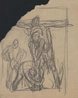 Levantamiento de la Cruz Boceto de trazos rápidos, con un grupo de siluetas que representan el momento en que a Jesús de Nazaret lo alzan en la cruz de su martirio. Una figura más atrás contempla tranquilamente la escena.