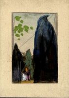 Los encapuchados Con el fondo de un paisaje de árboles y hojas verdes se ven dos figuras negras encapuchadas, una en primer plano y la otra más alejada. El dibujo está enmarcado en un cuadrado pequeño en el centro.