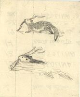 Los castores Dos figuras representan a dos castores: en la parte superior, ya en tierra con su rama en la boca y, en la parte inferior a otro en el agua, también con una rama en la boca. Destacan los colores oscuros sobre un fondo amarillento.
