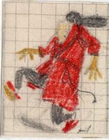 LOS BUSCADORES DE TESOROS. Sobre una superficie cuadriculada y en este dibuje donde se vislumbra la firma del pintor hacia la izquierda surge una mano negra del lado izquierdo que agarra por la espalda a un hombre cogiéndolo por su bata roja. El hombre se tambalea hacia atrás y bajo su bata se puede adivinar el pijama en tonos oscuros. Sus zapatillas son también rojas.Boceto realizado para la ilustración de la revista semanal Novelas y Cuentos. Titulo: Los buscadores de tesoros. Autor: W. Irvins. Nº publicado: 1329. Fecha: 28-10-1956. Tomo NC. 32.