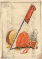 LOS DOS HERMANOS. Una bolsa de dinero de color marrón claro es seccionada en su mitad, como si fuese una fruta, por un cuchillo de mango marrón. Pequeñas monedas doradas se caen de la bolsa. El dibujo está enmarcado por suaves líneas a lápiz.Boceto realizado para la ilustración de la revista semanal Novelas y Cuentos. Titulo: Los dos hermanos. Autor: Erkman Chatrian. Nº publicado: 1119. Fecha: 19-10-1952. Tomo NC. 35.