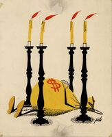 Los candelabros encendidos y un saco de dinero Cuatro candelabros con la vela encendida se destacan en este dibujo . Entre ellos destaca una bolsa de dinero amarilla de la que sobresalen brazos y piernas. El dibujo está firmado.Prueba de imprenta. Ilustración realizada para la revista semanal Novelas y Cuentos. Titulo: Autor: Nº publicado: Fecha: Tomo NC.: