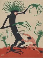Los dioses de Marte Un hombre lucha ferozmente contra unos árboles peculiares al que se les ha pintado con atributos humanos como brazos, en los que sobresalen grandes garras, y ojos. Dos árboles son verdes y el que se encuentra en primer término es negro. Está presente la firma del pintor en la composición.Prueba de imprenta. iñustracióntración realizada para la revista semanal de Novelas y Cuentos. Titulo: Los dioses de Marte;Autor:Edgar Rice Burroughs; Nº publicado: 825 Fecha: 02/03/47Tomo NC.: