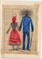 MARIANELA. La figura de dos enamorados cogidos de la mano y de espaldas es el motivo de este dibujo sobre una superficie cuadriculada. El hombre, alto, lleva un traje azul. La chica, más bajita, lleva una falda roja al igual que el pañuelo de su cabeza y un chal negro sobre la espalda.Boceto realizado para la ilustración de la revista semanal Novelas y Cuentos. Titulo: Marianela. Autor: Alvarez Quintero. Nº publicado: 1154. Fecha: 26-06-1953. Tomo NC. 46.