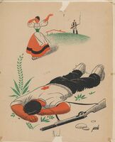 MARIANA SIRCA. Un hombre muerto yace en el suelo. En un segundo plano se ve una mujer con una actitud desesperada ante el suceso. Y sobre una colina un hombre con una escopeta observa la escena. El hombre tendido en el suelo lleva un pantalón negro y camiseta blanca. Sobre su espalda se ve la herida. El dibujo está firmado.Prueba de imprenta. Ilustración realizada para la revista semanal de Novelas y Cuentos. Titulo: Mariana Sirca. Autor: Grazia Deledda. Nº publicado: 935. Fecha: 10-04-1949. Tomo NC.: 10