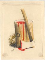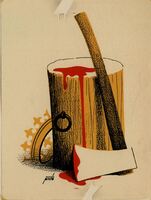 MARIA ESTUARDO Sobre un cubo amarillento del que salen manchas rojas pareciendo sangre se apoya el hacha de la ejecución real, manchada igualmente de rojo. En este caso se puede apreciar el posible boceto de la firma del artista.Boceto realizado para la ilustración de la revista semanal Novelas y Cuentos. Titulo: María Estuardo. Autor: Federico Shiller. Nº public.: 1099. Fecha: 01-06-1952. Tomo NC.: 39. PI/. 183.