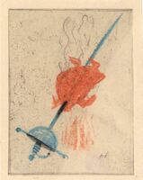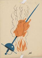 MI TIO BENJAMIN. Un pollo espetado en una espada azul está dispuesto para asarse sobre una hoguera de llamas rojizas de la que se desprende humo gris. La composición está firmada.Prueba de imprenta. Ilustración realizada para la revista semanal Nov elas y cuentos. Titulo: Mi tío Benjamín. Autor: Claudio Tiller. Nº publicado: 957. Fecha: 11-09-1949. Tomo NC.: 11.